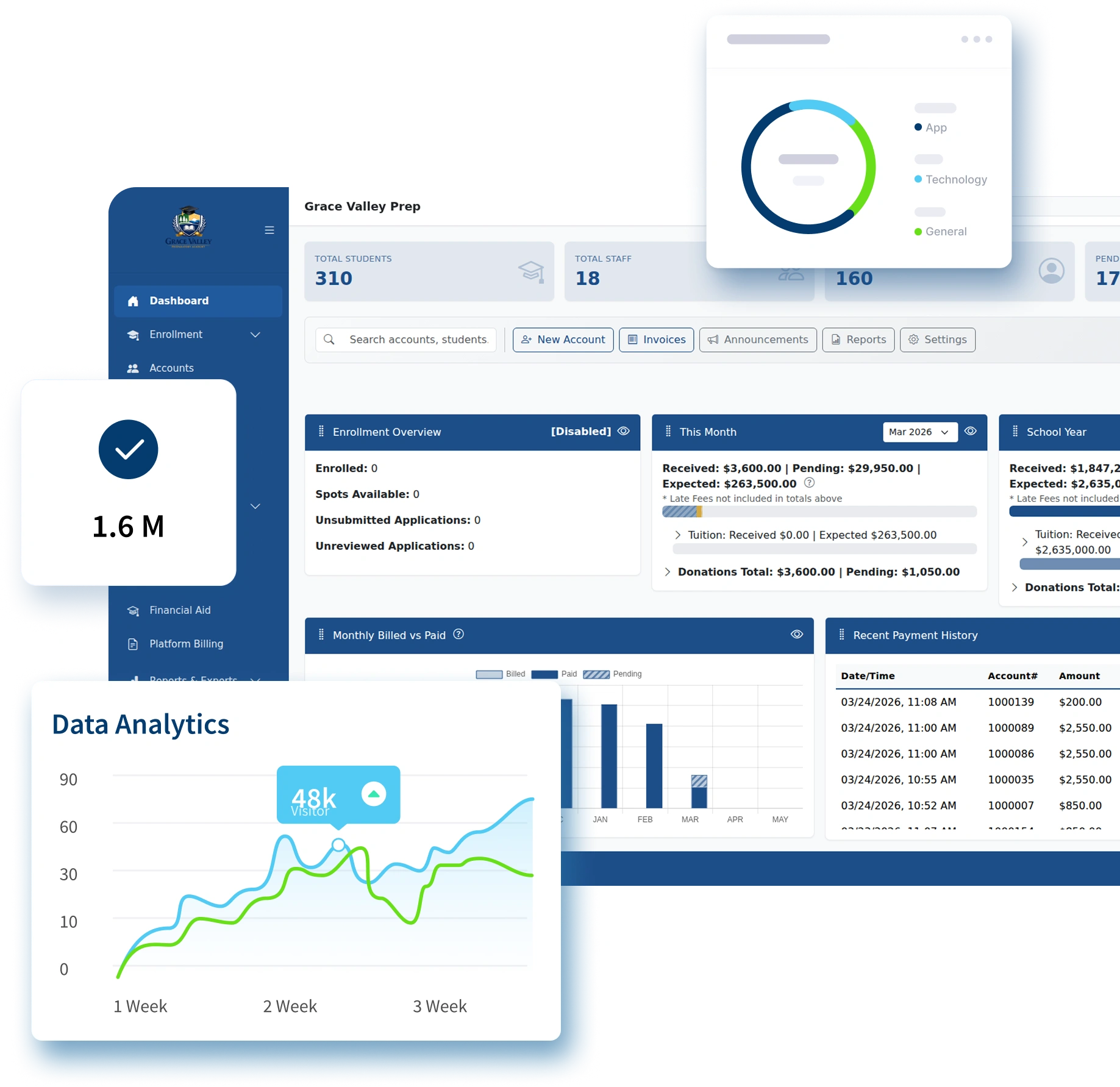 Acadesync offers a robust online tuition and enrollment system, encompassing essential tools for seamless payment and registration processes—whether online or in the school office. Streamline everything with our all-in-one solution.